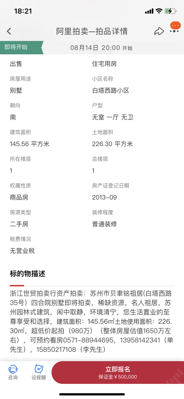 据拍卖平台上标的物介绍,这件拍品位于苏州市姑苏区平江街道白塔西路35号,是一栋苏州园林式的四合院别墅,建筑面积有145.56平米。这栋建筑建于明代,上世纪初曾为贝聿铭父亲的居所。