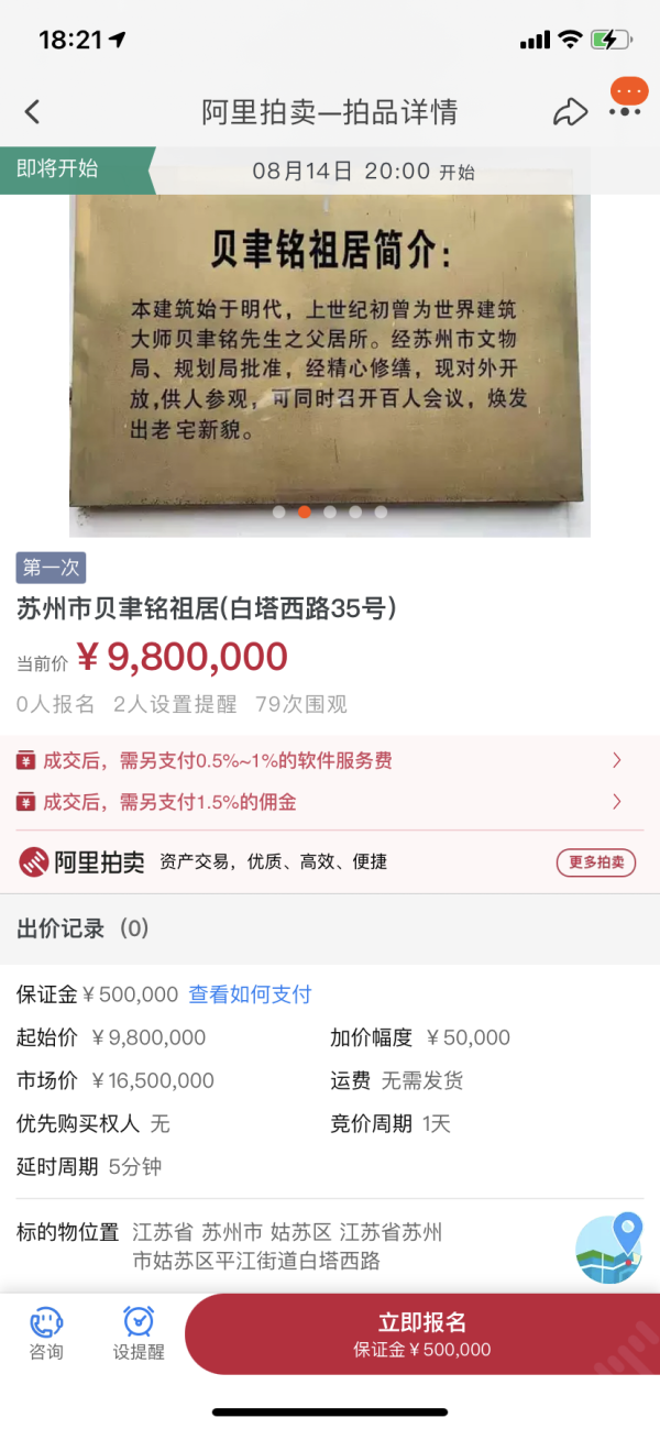 8月11日,记者在阿里拍卖上看到,建筑大师贝聿铭的苏州祖居将于8月14日20时开拍,起拍价980万元,整体房屋估值1650万左右。