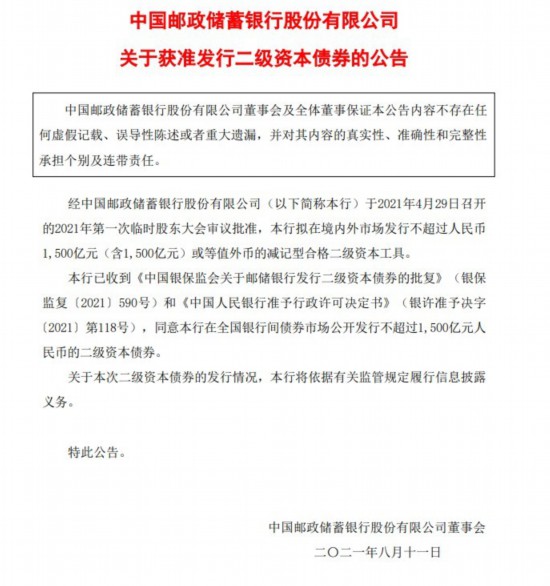 昨日,中国邮政储蓄银行发布公告称,经2021年4月29日召开的2021年第一次临时股东大会审议批准,该行拟在境内外市场发行不超过人民币1500亿元(含1500亿元)或等值外币的减记型合格二级资本工具。中国邮政储蓄银行称已收到《中国银保监会关于邮储银行发行二级资本债券的批复》(银保监复〔2021〕590号)和《中国人民银行准予行政许可决定书》(银许准予决字〔2021〕第118号),同意该行在全国银行间债券市场公开发行不超过1500亿元人民币的二级资本债券。