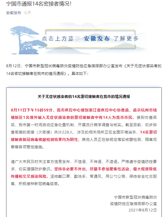 荔枝新闻讯 据“安徽发布”微信公众号发布的消息,8月12日,宁国市新型冠状病毒肺炎疫情防控应急指挥部办公室发布《关于无症状感染者的14名密切接触者在我市的情况通报》。具体如下: