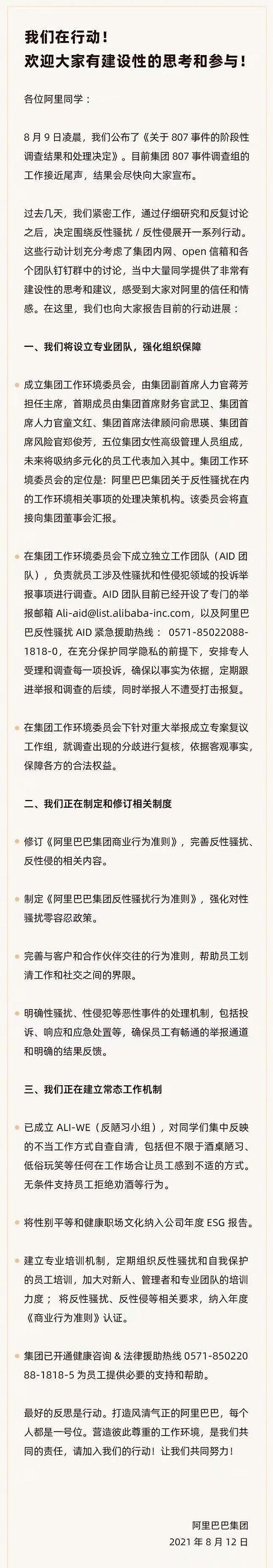 荔枝新闻讯 8月12日,阿里巴巴集团公布了推动反性骚扰的机制化工作进展。阿里正在制定《阿里巴巴集团反性骚扰行为准则》,强化对性骚扰零容忍。已成立ALI-WE(反陋习小组),对集中反映的不当工作方式自查自清,包括但不限于酒桌陋习、低俗玩笑等在工作场合让员工感到不适的方式。内部信还强调,“无条件支持员工拒绝劝酒等行为”。