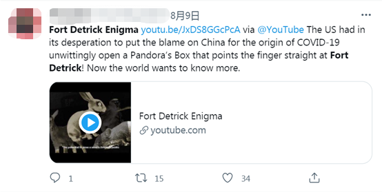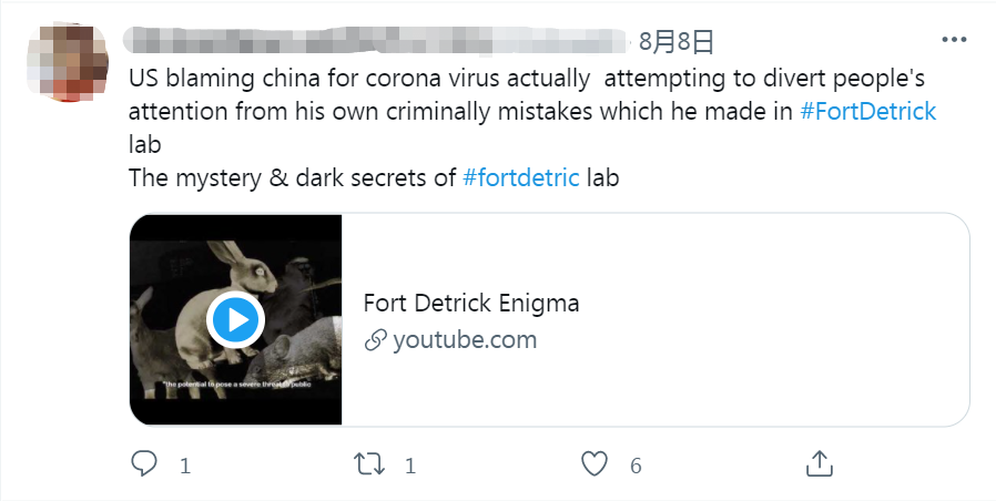 译文:美国将新冠病毒归咎于中国,实际上是想把人们的注意力从美国在德堡实验室犯下的罪,转移到中国身上!