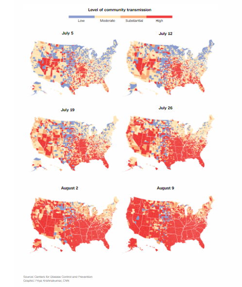 CDC的最新数据显示,被认为是新冠病毒传播率为“高”水平的县的数量出现了惊人的增长。当地时间8月9日,美国有2361个县被列入“高”水平地区,与7月初的457个县相比,这一数字大幅上升。过去五周的情况表明,社区传播在全美的增长速度有多快。