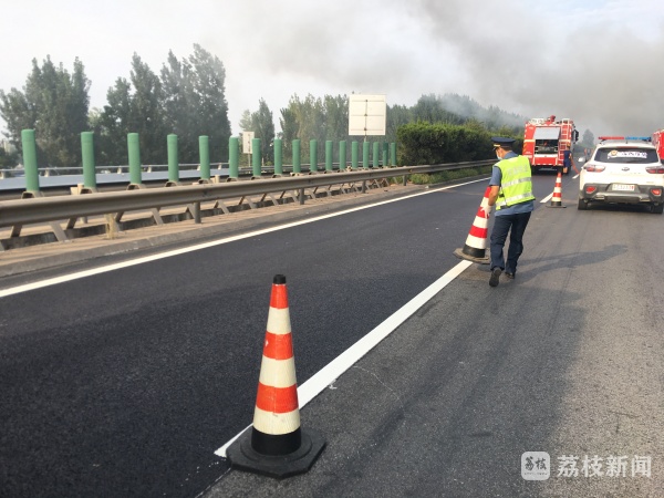 执法人员立即将驾驶员引导至安全区域,迅速设置好交通警示标志,并在来车方向疏导交通。高温天气加上车辆自燃产生的热量,不一会执法人员的衣服就湿透了。为避免道路长距离拥堵,执法人员通知监控中心在沿线的可变情报板上,发布事故信息,提醒车辆提前绕行。