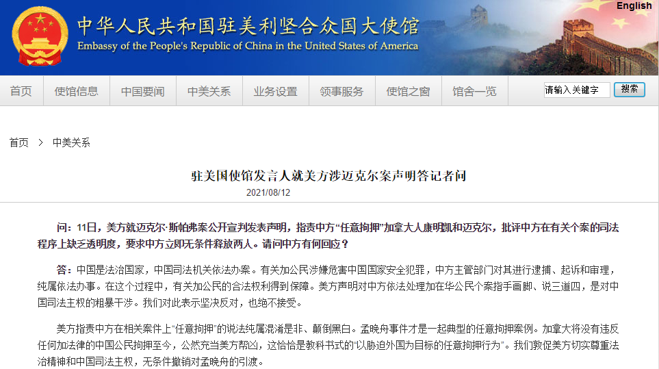 驻美国使馆发言人就美方涉迈克尔案声明答记者问