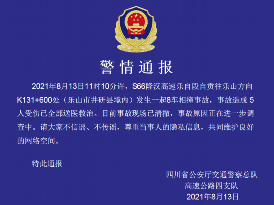 记者从四川省公安厅交通警察总队高速公路四支队获悉,8月13日上午11时许,S66隆汉高速乐自段自贡往乐山方向K131+600处(乐山市井研县境内)发生一起8车相撞事故,事故造成5人受伤已全部送医救治。