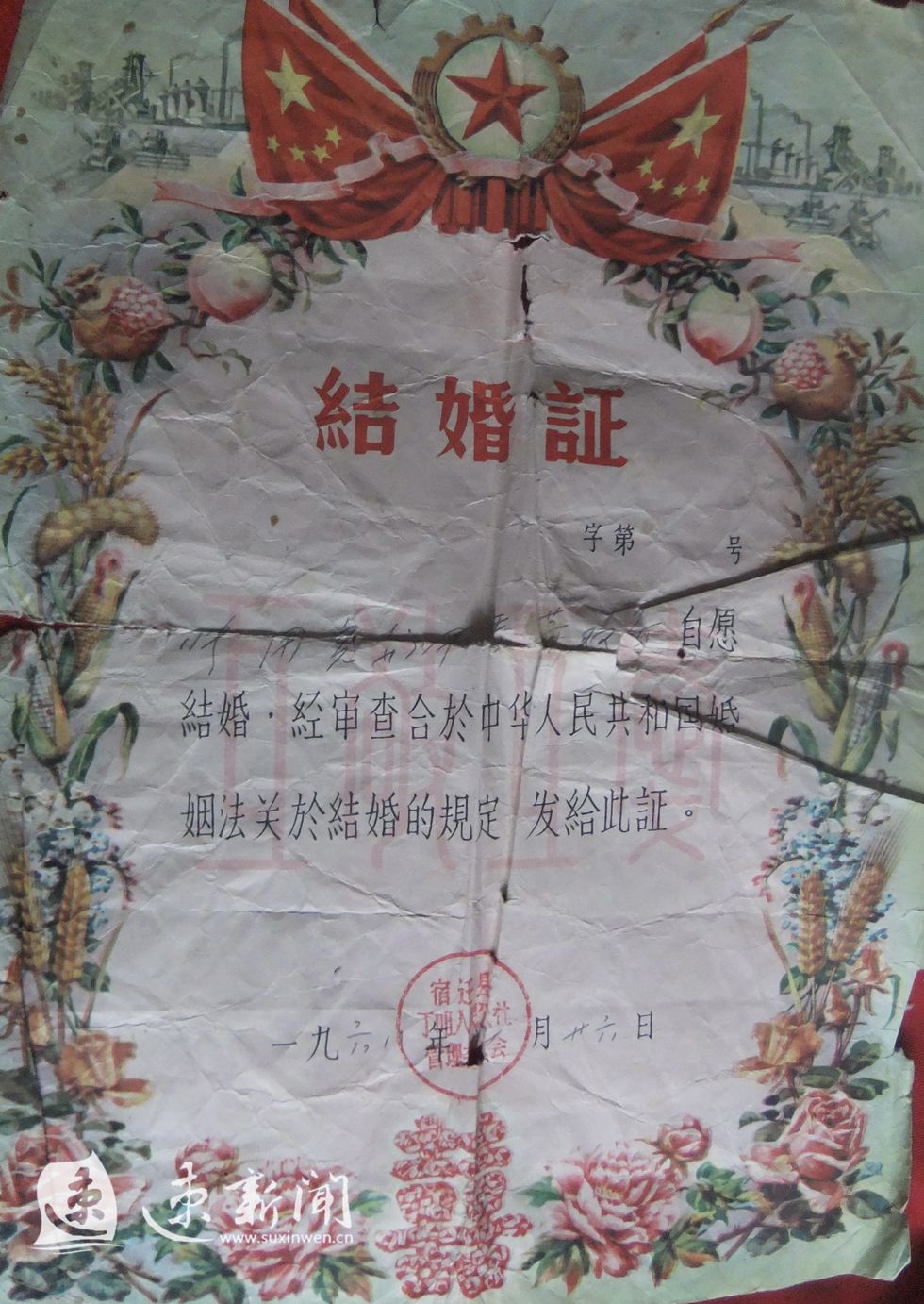 记者发现,这张结婚证看起来像一张奖状。五角星、红旗、红双喜、鲜花、玉米、稻谷、石榴等图案围成一个象征喜庆和丰收的边框,边框里最上面是三个红字——结婚证。主体部分内容是:刘鼎佑,男,二十三岁,周玉兰,女二十一岁,自愿结婚,经审查合于中华人民共和国婚姻法关于结婚的规定,发给此证。日期是1962年12月12日,落款处盖着宿迁县宿城镇人民委员会的印章。