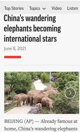 美联社在“中国游荡的象群成为国际明星”报道中为中国点赞:大象在中国受到高级别的保护,它们数量在稳步增加。