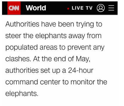 美国CNN报道称,为了防止任何人象冲突,中国甚至建立了一个24小时指挥中心来监控大象行踪。
