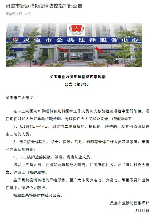 在市二院医院耳鼻喉科和儿科医护工作人员10人核酸检测混检中呈弱阳性,现在正在对10人分开单独核酸检测。为确保广大人民群众安全,特通知如下: