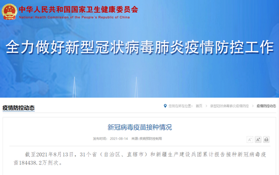 截至2021年8月13日,31个省(自治区、直辖市)和新疆生产建设兵团累计报告接种新冠病毒疫苗184438.2万剂次。