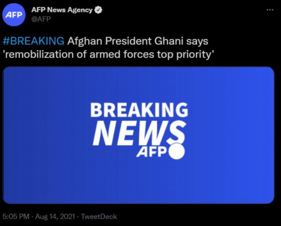 阿富汗局势持续紧张,法新社刚刚消息称,阿富汗总统加尼表示:“重新动员武装力量是当务之急。”