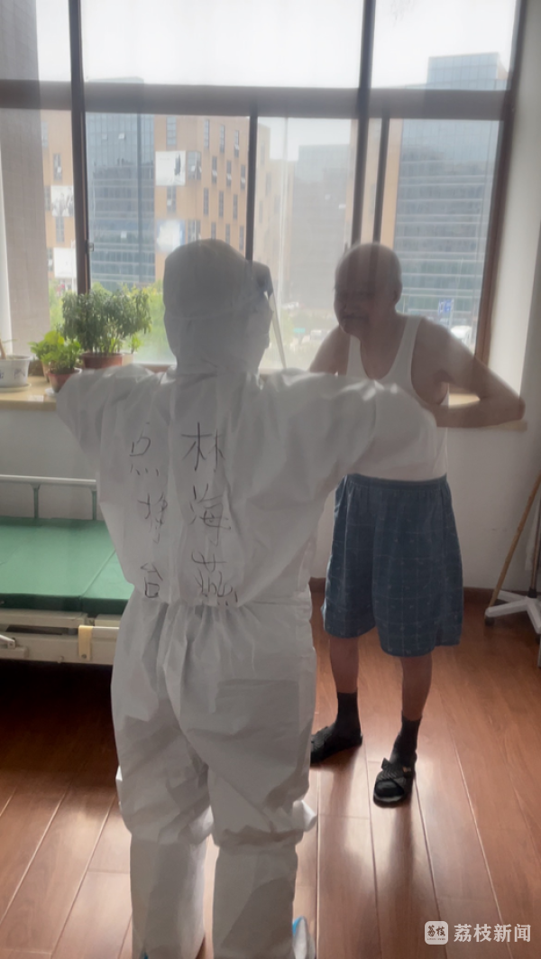 在集中隔离点,疫情阻断了老人们与家人团聚的道路,陌生的环境更是让老人容易感到焦虑不安与情绪低落。此后,林海燕更加积极对孙爷爷进行心理疏导与健康锻炼,虽然穿着防护服时常汗流浃背,林海燕却始终坚持陪伴孙爷爷做健康操来增强身体机能,告诉他要保重身体才能健健康康地看着重孙长大。通过夜以继日的陪伴,孙爷爷的身体与心理状况得到了恢复,不仅主动来接餐食,也愿意和工作人员进行交流谈心了。相信有“大白”林海燕及其他工作人员的积极鼓励和悉心照料,孙爷爷一定会早日与自己的家人们相见!