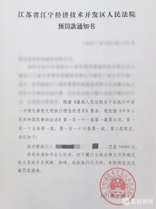 今天(8月14日),记者从南京市中级人民法院获悉,近日,江宁开发区法院开出首张《预罚款通知书》,责令被执行人限期履行法律义务,取得了良好的法律效果和社会效果。