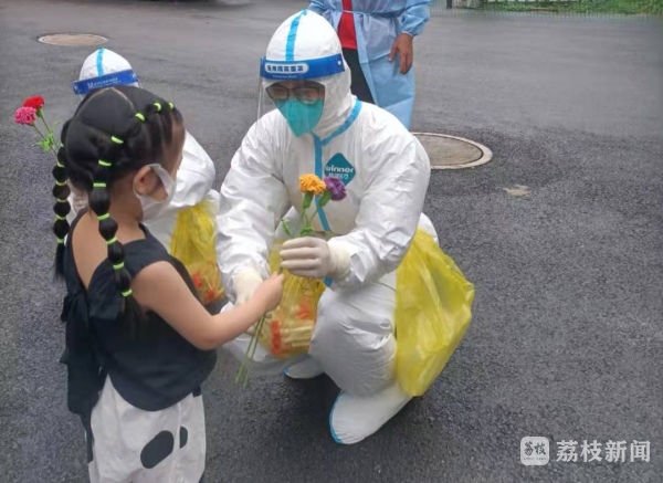 上午,在成功社区铺头村,一个小朋友把一朵朵手作的康乃馨送给了为他们上门做核酸检测的医护人员。“谢谢你们,在这个夏天流过的汗,谢谢你们,和我们一起守护南京,情人节快乐”!
