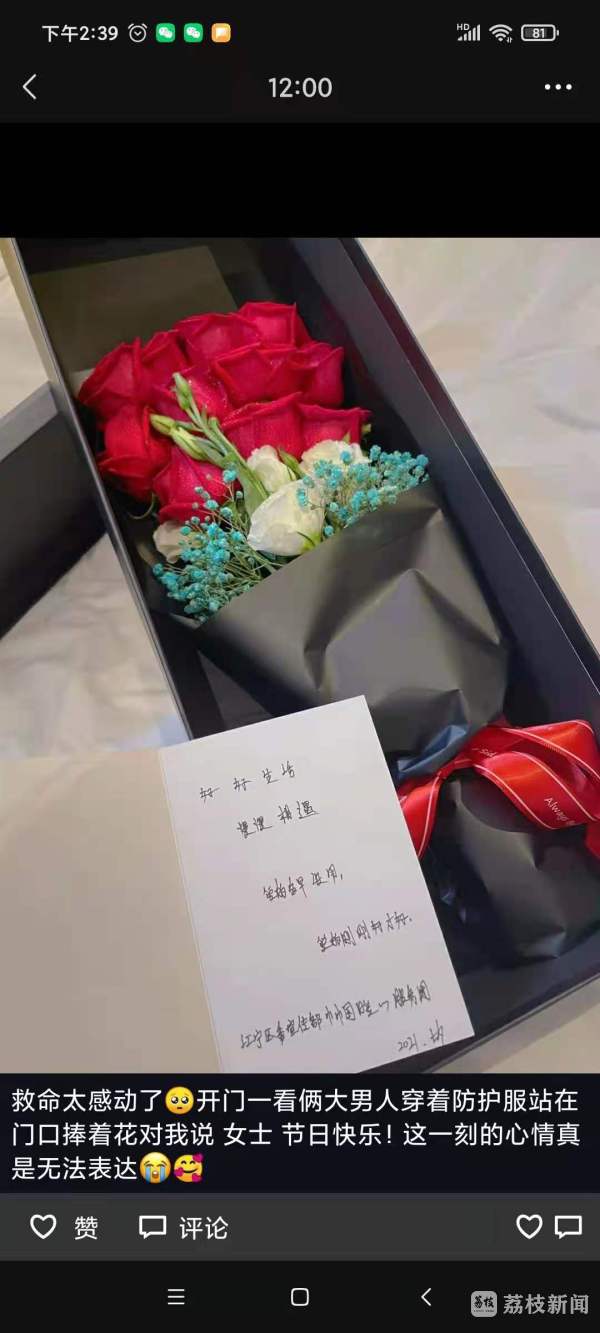 值此七夕节,当工作人员将鲜花送给正在隔离的张女士,并为她播放同被隔离在酒店的丈夫许先生提前录制的爱的告白视频时,她既意外又惊喜,连声感谢工作组的用心用情。 一束精美包装的鲜花、一张张工作人员亲笔手写的祝福卡片,让整栋楼里的女同胞激动不已,纷纷开心地分享着朋友圈……