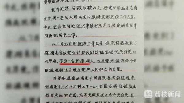 眼前这个看起来清爽干练的女孩就是吴娟,她是盐城建湖县今年引进的名校优生,毕业于东南大学俄语系的硕士,7月25日刚刚来到九龙口旅游度假区工作,负责旅游宣传策划等方面工作。在听说县九龙口温泉度假酒店将成为接收扬州来湖隔离医学观察人员的隔离场所后,吴娟作为镇区的一员,也和大家一起,彻夜奋战,搬运物资、铺地胶、整理床铺等,大大小小的事情她都全身心投入。盐城建湖九龙口旅游度假区工作人员吴娟告诉记者:“我在这边就看到了这边的党员干部,包括一些基层的村干部,他们就是总是冲在一线,然后为抗击疫情在做努力,尤其是前天晚上,还有昨天白天的时候,我也有幸参与了跟他们一起就是布置这个九龙口温泉酒店的隔离服务中心的这个预备工作,然后他们就非常的认真而且也不辞辛苦。”