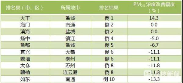 PM2.5浓度改善幅度相对较差的后10位(倒1—10名)依次是: