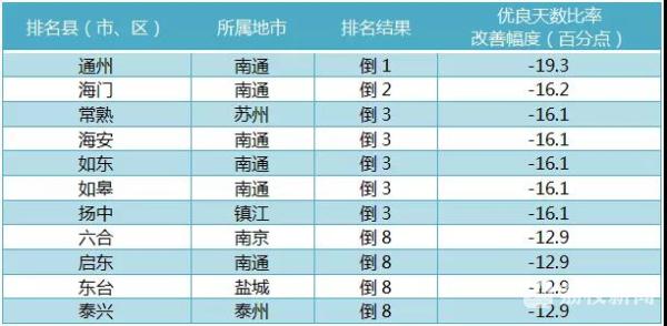 优良天数比率改善幅度相对较差的后10位(倒1—10名)依次是: