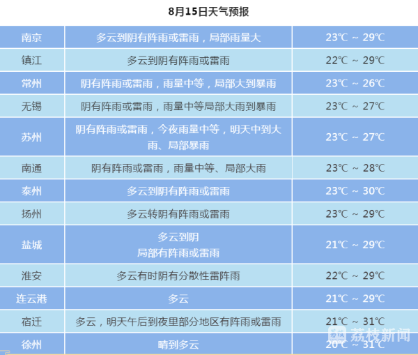 从今天夜里到15日,淮河以南地区将有阵雨或雷雨,沿江和苏南地区雨量中到大,局部暴雨。其他地区多云到阴。明天最高温度:苏南地区27~28℃。其它地区30℃左右。