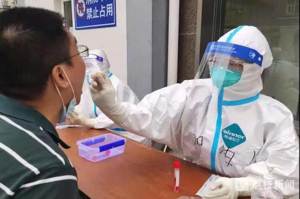 8月8日支援抗疫第一天,张楠与同事早上6点就从赣榆前往扬州市指定地点集合,领到工作任务后,立马前往扬州市广陵区一家菜市场开展核酸检测,当天工作时长近12个小时,张楠咬牙坚持完成了500多份检测任务,回到酒店已接近凌晨。