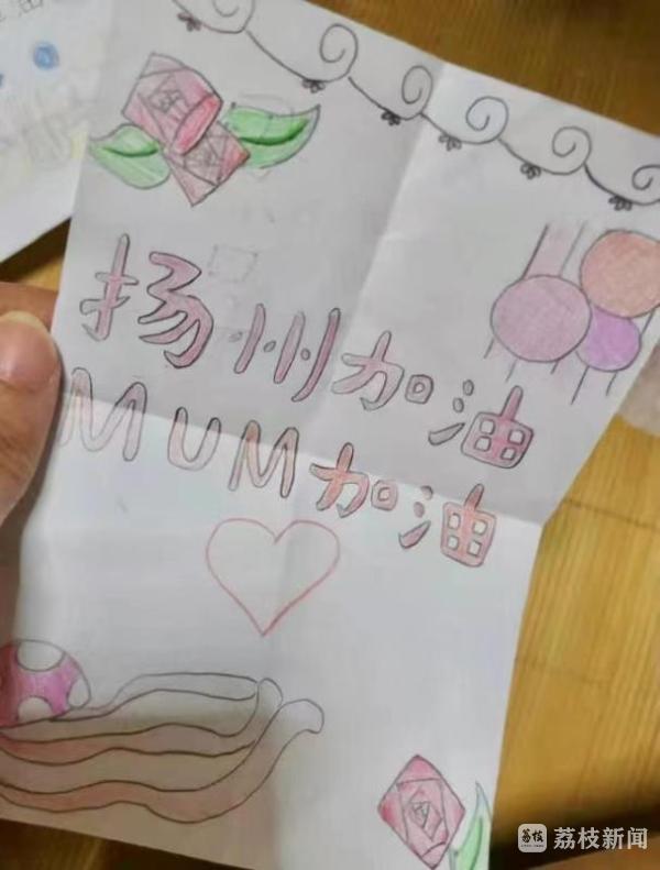 第一次志愿服务临行前,她收到了来自孩子亲手制作的贺卡:“扬州加油,MUM加油!”真诚的鼓励和稚嫩的画风更加坚定了孙老师在抗疫一线坚守好岗位的决心。