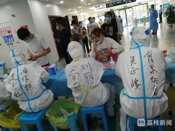 在南京市建邺区莫愁湖小学核酸采样点,江苏省自然资源厅团委书记魏黎黎也身着厚重的防护服,在学校门口维持秩序、验码测温,因为天气炎热,她的护目镜已经蒙上了一层雾。