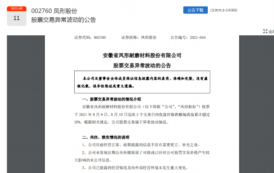 8月10日晚间,凤形股份曾发布股票交易异常波动的公告。凤形股份表示,公司目前经营正常,前期披露的信息不存在需要更正、补充之处;未发现近期公共传媒报道了可能或已经对公司股票交易价格产生较大影响的未公开信息,以及公司已披露的经营情况及内外部经营环境未发生重大变化。