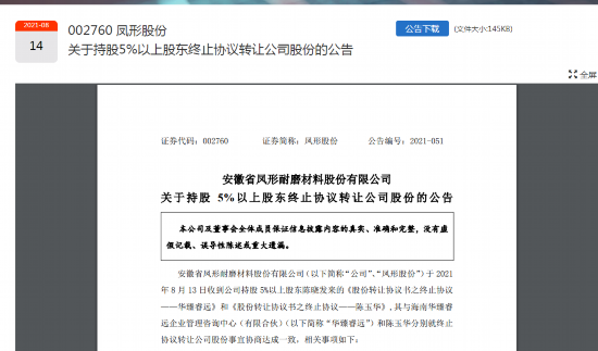 14日,凤形股份发布公告称,公司于2021年8月13日收到公司持股5%以上股东陈晓发来的《股份转让协议书之终止协议——华臻睿远》和《股份转让协议书之终止协议——陈玉华》,其与海南华臻睿远企业管理咨询中心(有限合伙)(“华臻睿远”)和陈玉华分别就终止协议转让公司股份事宜协商达成一致。