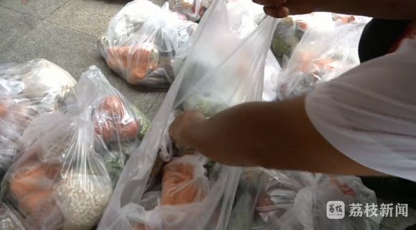 小区物管告诉记者,一开始都是他们送到业主门上,眼看着饭点到了,为了菜品及时送达,就在群里发了公告,“现在因为到中午了,业主们要做饭,就在群里发一下,让广大业主到西门来领,一份基本上可以满足三口之家两三天的量。”