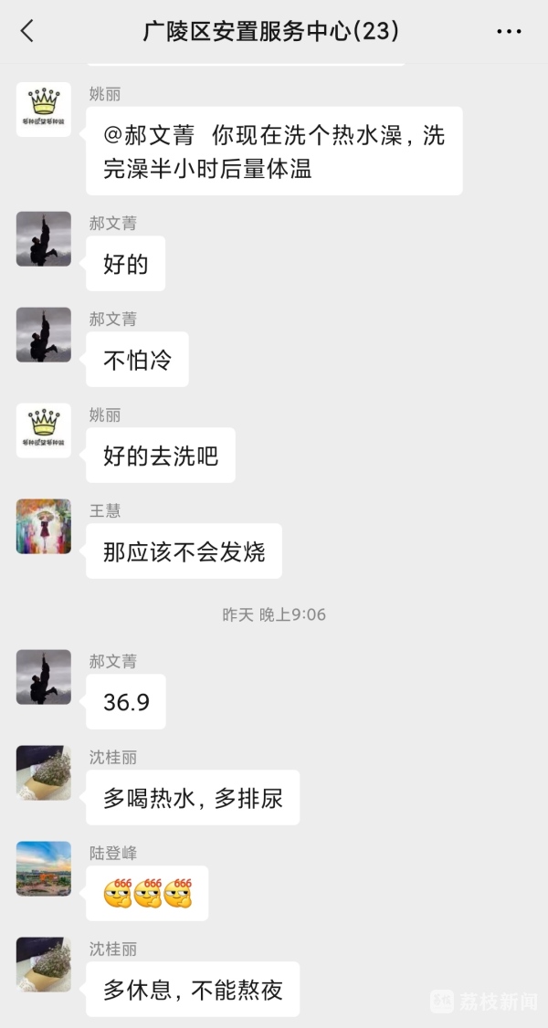 8月8日中午12点左右,来自河北邢台参加夏令营培训滞留在扬入驻集中安置点的郝某某,突然说自己身体不舒服,疑似感冒,有流鼻涕、鼻塞头疼、嗓子痒、乏力等症状,工作人员了解后,立即与之对接,经过详细询问沟通后,嘱咐她不要紧张、空调温度不要太低、多喝水、密切关注体温,每半小时报送一次,同时由集中安置点负责人第一时间上报应急管理组,随时准备就医。随后,郝某某体温一直保持在36.8度到37.1度,晚上11点左右,工作人员再次询问其症状有没有缓解、需不需要送医,其答复没有缓解、需要时,集中安置点立马与武警医院取得联系,组织人员连夜将其送武警医院就医,密切关注其病情,9日下午2点左右,又将接受完治疗、症状好转且核酸再次检测为阴性的郝某某安全接回了“家”,无微不至的呵护,受到郝某某的频频感谢。
