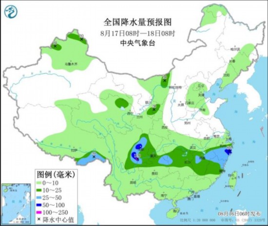 8月17日8时至18日8时,江南大部、四川盆地中西部和南部、贵州北部、西藏东南部以及新疆北疆北部、青海东北部、宁夏等地的部分地区有中到大雨,其中,浙江东部、四川盆地西部等地的局部地区有暴雨或大暴雨(100~120毫米)。