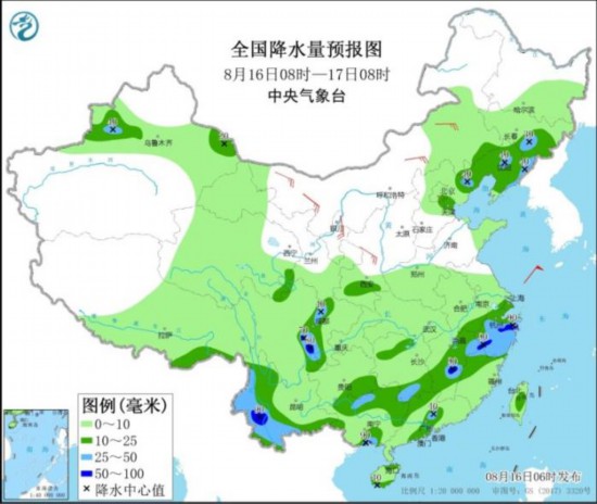 8月16日8时至17日8时,江南中东部、华南中西部、湖南南部、贵州南部、云南南部和西部、四川盆地西部、西藏东南部以及内蒙古东南部、北京东南部、天津大部、河北东北部、辽宁、吉林东南部、台湾岛中部等地的部分地区有中到大雨,其中,浙江东北部和西南部、福建西北部、江西东部、广西南部沿海、四川盆地西南部、云南西南部等地局地有暴雨(50~90毫米)。