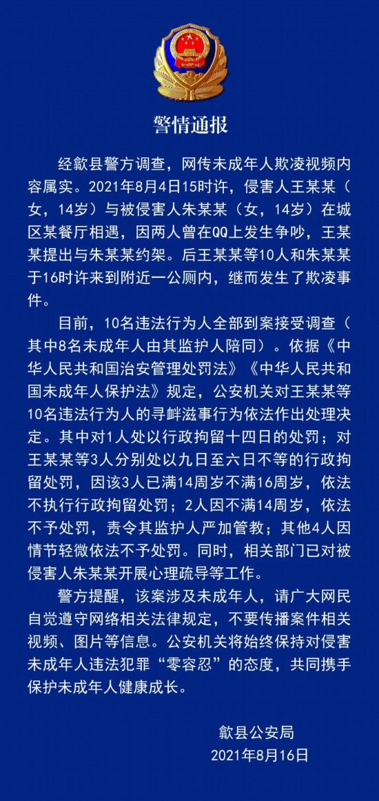 荔枝新闻讯 8月16日,安徽歙县警方发布警情通报:因QQ发生争吵后约架,已对10人做出处罚。其中对1人处以行政拘留十四日的处罚;对王某某等3人分别处以九日至六日不等的行政拘留处罚,因该3人已满14周岁不满16周岁,依法不执行行政拘留处罚;2人因不满14周岁,依法不予处罚,责令其监护人严加管教;其他4人因情节轻微依法不予处罚。8月13日,一段疑似未成年人欺凌的视频在网络传播。视频中一女生被多名女生在厕所遭围堵后被多人轮流掌掴,一女生连续掌掴20次。