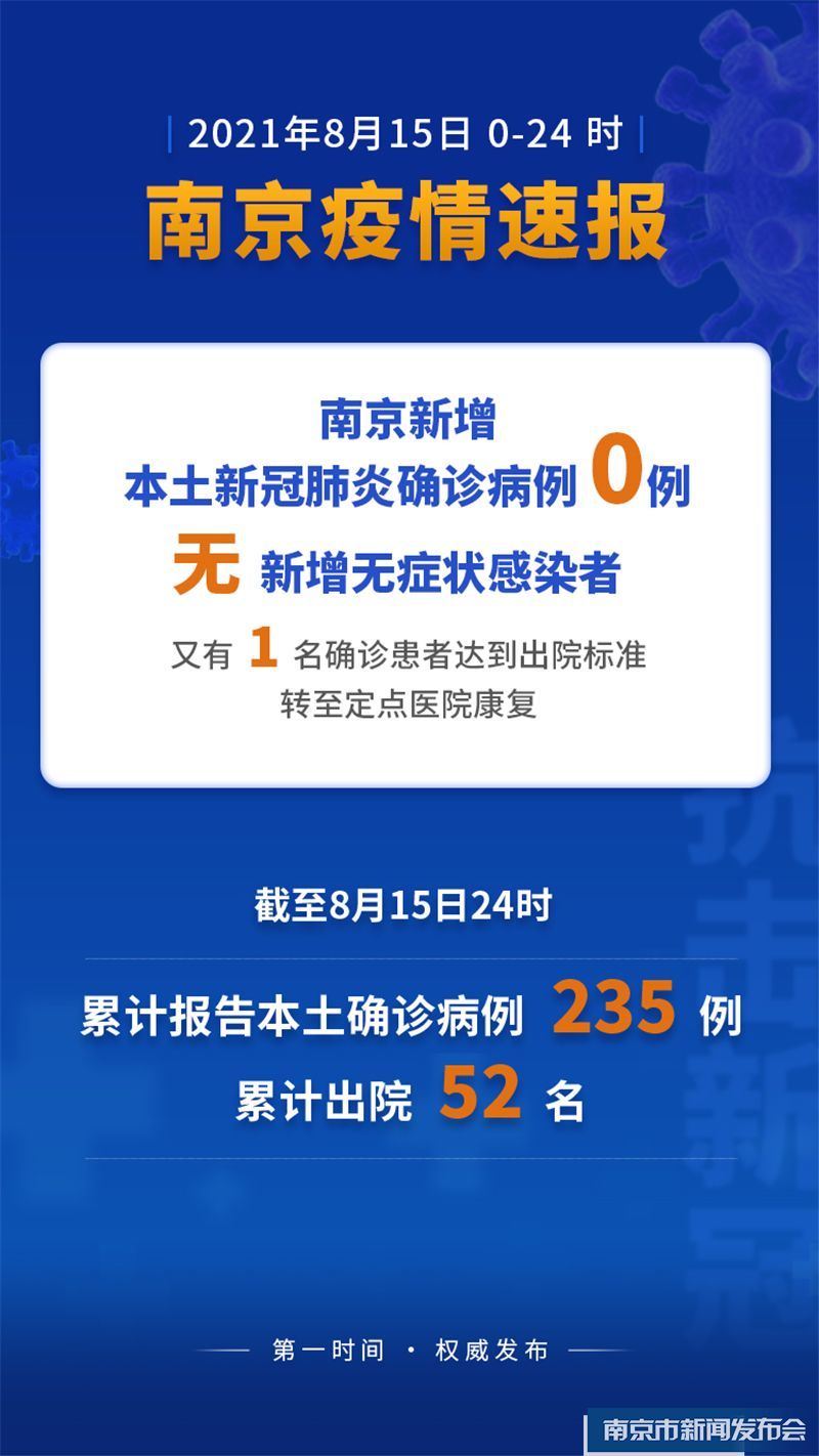 南京市卫健委副主任丁小平通报新增病例情况:2021年8月15日0-24时,南京市没有新增本土新冠肺炎确诊病例和无症状感染者。经过医护人员的精心治疗,经专家评估,有1名确诊患者达到出院标准,今天将转至定点医院康复。截至8月15日24时,本轮疫情累计报告本土确诊病例235例,出院52例。