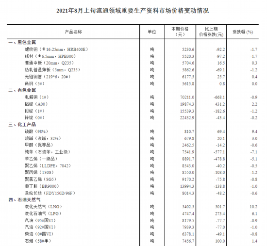 央广网北京8月16日消息(记者 杨崇)16日,国家统计局发布2021年8月上旬流通领域重要生产资料市场价格变动情况。