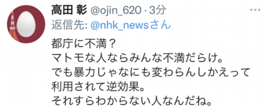 因近期东京都新冠疫情仍未得到有效控制,日本民众间有很多抱怨的声音,面对这起恶劣事件,多数日本网友并不感到意外。有网友称,“看来是积攒下来的对东京都(政府)的不满达到了忍耐的极限”。