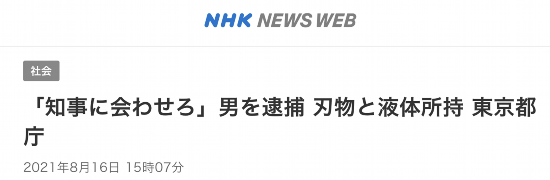 NHK称,该男子年龄约40岁,16日下午1时许闯入位于新宿区的东京市政府大楼,在2层入口处大喊:“让我见(东京都)知事!”,并与警备人员发生争执。随后该男子移动至市政大楼的地下停车场。据ANN报道,当地警方下午1时20分左右接到东京市政府大楼员工报警称,在停车场有携带汽油的男子正在与警备人员对峙。警方随后赶到市政大楼,将其当场逮捕。