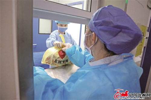 采样后的棉签,头部装入取样管后,贴上相当于“身份证”的条形码,仔细地封袋,装入一个透明的密封箱内,然后由穿着防护服的工作人员送到徐医附院东院感染疾病科PCR实验室的传送舱,由传送舱头送到实验室内进行检测,外人无法随意进入。