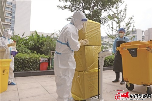 上午10点多钟,穿着防护服的工作人员将一箱箱用黄色包装密封的医疗废物运出病房大楼,箱子上面印着医疗废物的标志和危废中心的电话,写着“高度危险感染性废物”几个醒目的大字。垃圾收集员郑先成仔细地一箱箱称重、记录,这些数据都要上传到危险废物智慧监管平台上。随后,郑先成用手推车将这些医废送到百米之外的核酸采集点医疗废物暂存点。他说,最近自己平均每天运送大约35公斤核酸检测医疗废物。