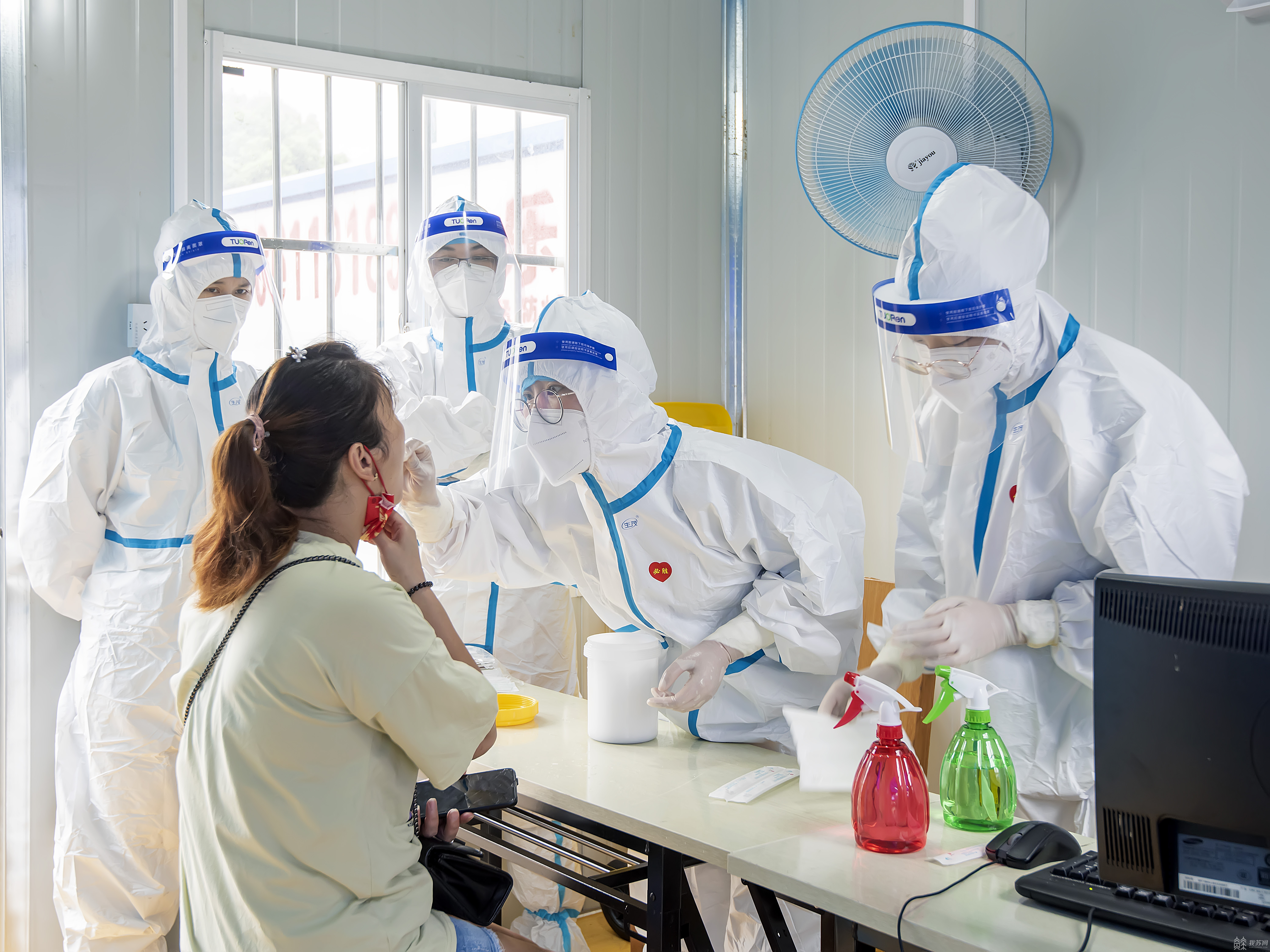 志愿者在采样现场设置了测温扫码处、信息登记处、等候处、检测处等多个工作分区。在测温扫码处,采样人群戴着口罩,出示“苏康码”“行程码”,在人行通道里有序通行;在信息登记处,志愿者们熟练地为没有准备预制码的采样对象申请预制码并打印;等候区里采样人群10人一组保持一米间隔排队等候……