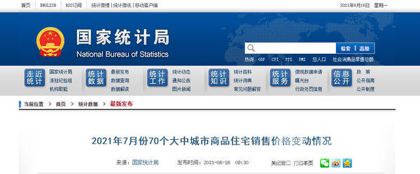 2021年7月全国70个大中城市中,呼和浩特、昆明、唐山、秦皇岛、牡丹江、安庆、赣州、平顶山、岳阳、常德、韶关、桂林、泸州、南充、遵义、大理16个城市新建商品住宅价格环比下降,太原、哈尔滨、惠州3个城市新建商品住宅价格与上月持平,其余51个城市环比上涨。房地产市场商品住宅销售价格环比涨幅回落。