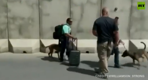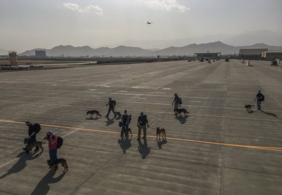 (军犬同美军一同现身机场,准备撤离。)