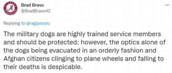 也有网友联想到了此前“阿富汗人躲美军机起落架舱后掉落”的悲剧。“军犬是训练有素的服务成员,应当受到保护。然而,光是看到军犬有序撤离,而阿富汗公民紧抓着飞机轮子并掉下来摔死,就令人不齿。”↓