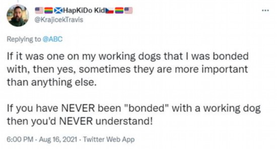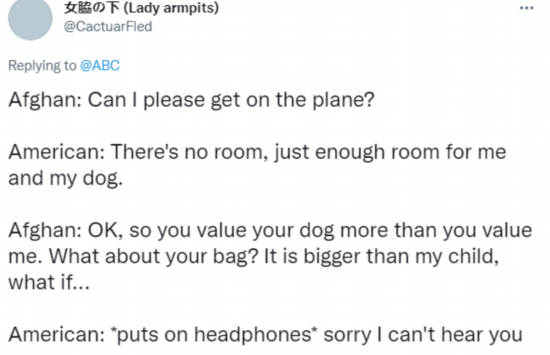 还有网友表示,“这张照片非常适合阿富汗人用于宣传。你们比狗卑微。(这)完美地描绘了(美国的)背叛。”↓
