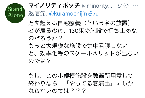 还有网友评论称,现在东京都居家疗养的新冠肺炎患者过万,设置130张病床的设施只是杯水车薪,并质问道,“如果只是零星设置这种小规模的设施后就没有下文了,那不就是‘我在工作’的一种作秀么?”