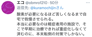 有网友称,这意味着“病情恶化至必须接受吸氧治疗前,新冠肺炎患者必须在家中忍耐。真正需要的是收容轻症患者的设施,在那里能够得到治疗就不会出现重症患者。这个措施可谓是本末倒置”。