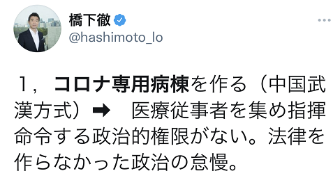 针对日本政府设置“供氧站”,而不是方舱医院,日本前大阪府知事桥下彻分析称,“日本无法效仿中国武汉建设‘新冠专用病院’的原因是,日本政府没有权力召集并指挥医疗工作者。这是日本政府怠慢立法的结果”。