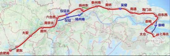 北沿江高铁,起自上海枢纽新建上海北站,终至合肥南站,经崇明岛至南通、泰州、扬州、南京北站至合肥。线路运营长度554.59km,江苏省境内新建线路365.50km,设计速度目标值350公里/小时。