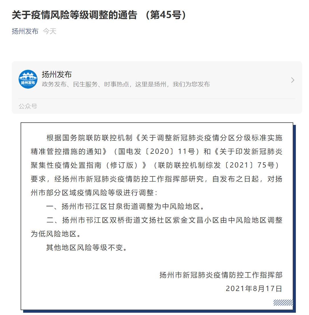 一、扬州市邗江区甘泉街道调整为中风险地区。